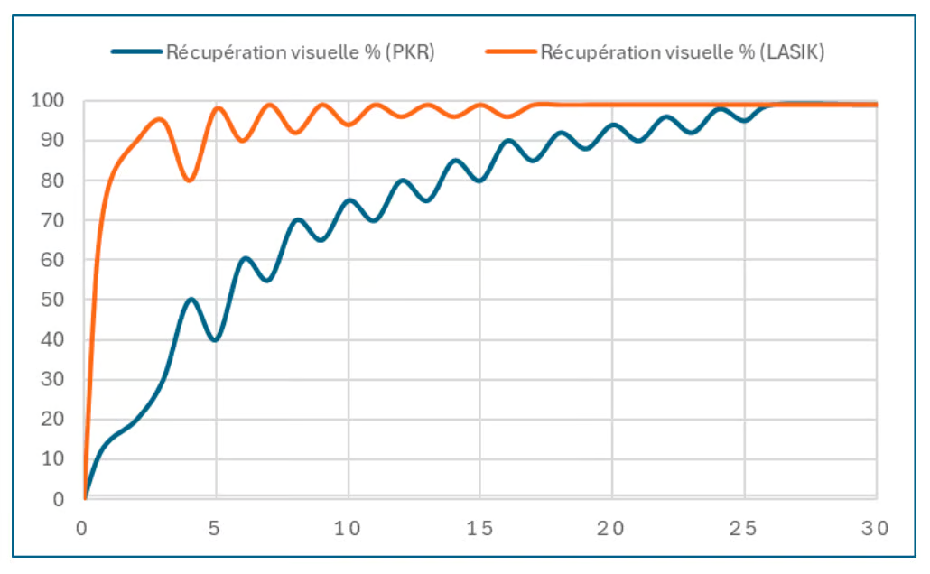 Temps de récupération visuelle d’environ une semaine pour la reprise du travail. Inconfort lié à la cicatrisation pendant les 48-72 premières heures.
